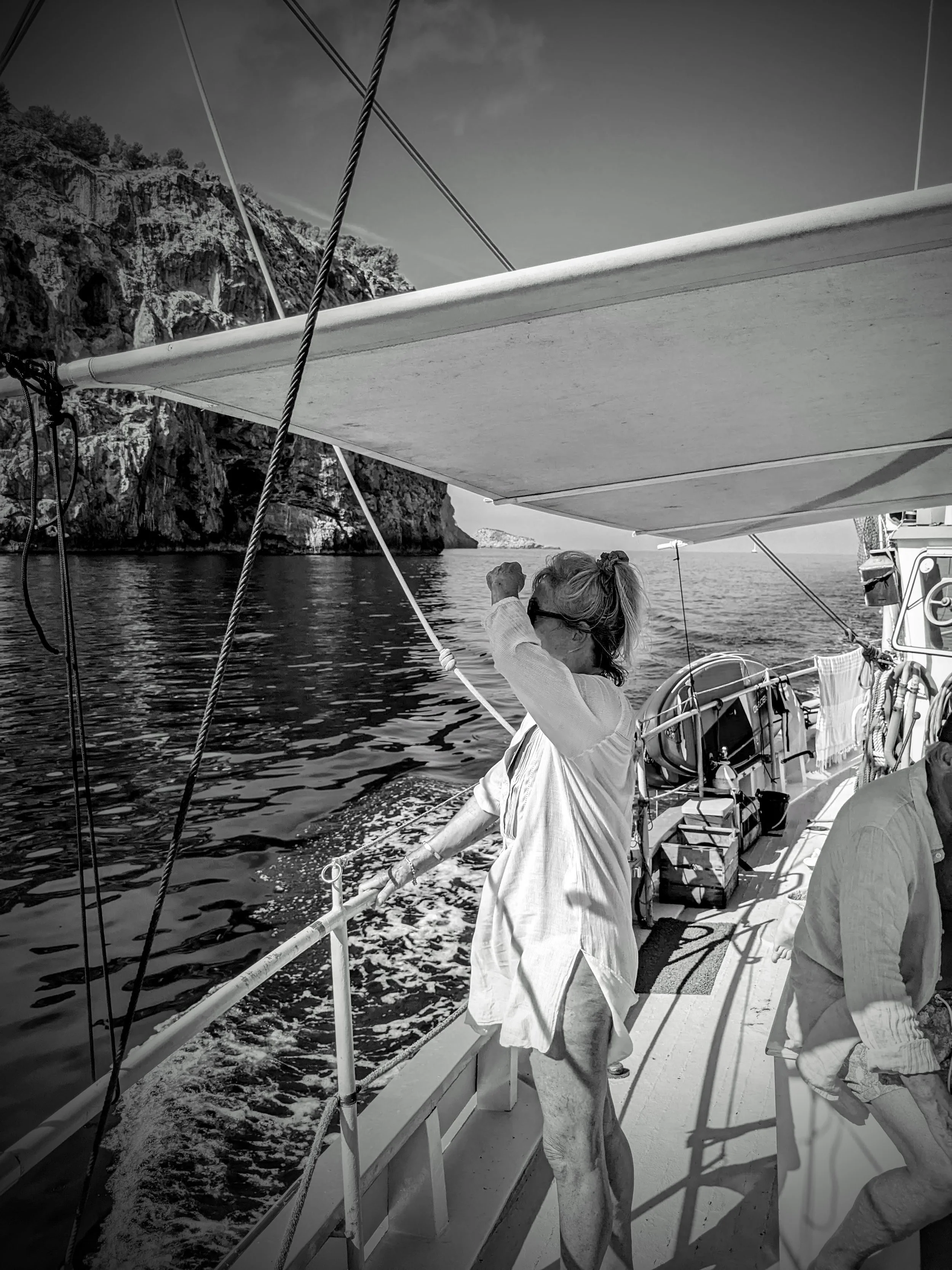 A woman standing on a boat, holding a rope, with a rocky cliffside in the background, during daytime.