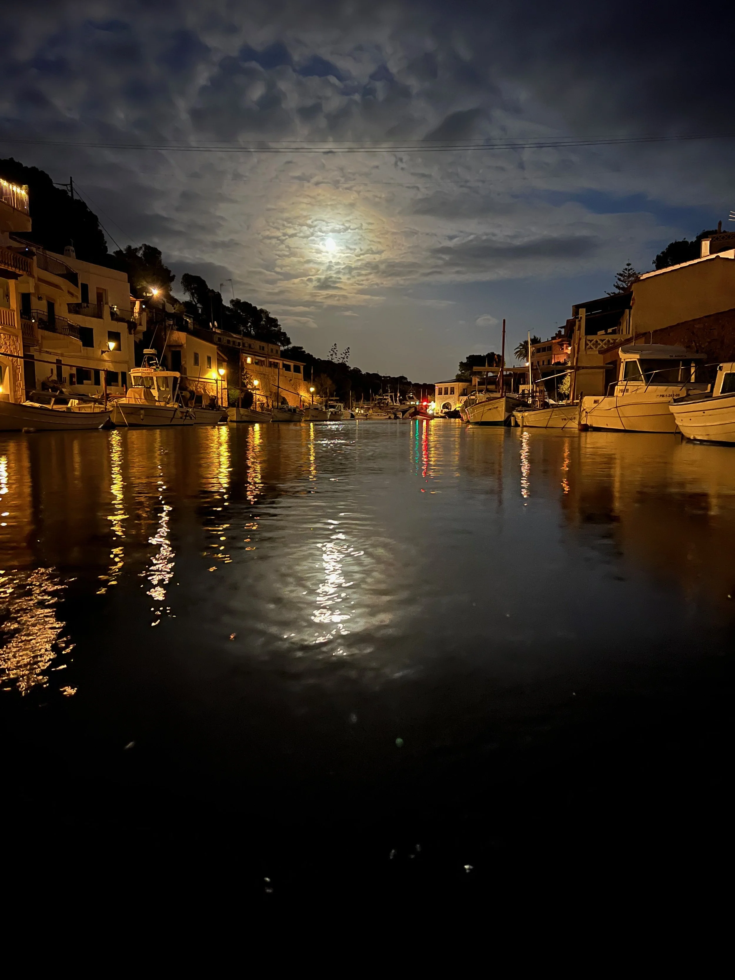 We made our way slowly into the tiny harbour, looking for our mooring — and there it was, right on the fishing dock in the centre of the cala. Surrounded by tiny whitewashed houses, almost every one with its own little boathouse below. A truly beautiful Spanish fishing village. The whole dock was full of people working away, preparing for the shooting the following day. This organised chaos was going to be part of our daily life for the next couple of days.